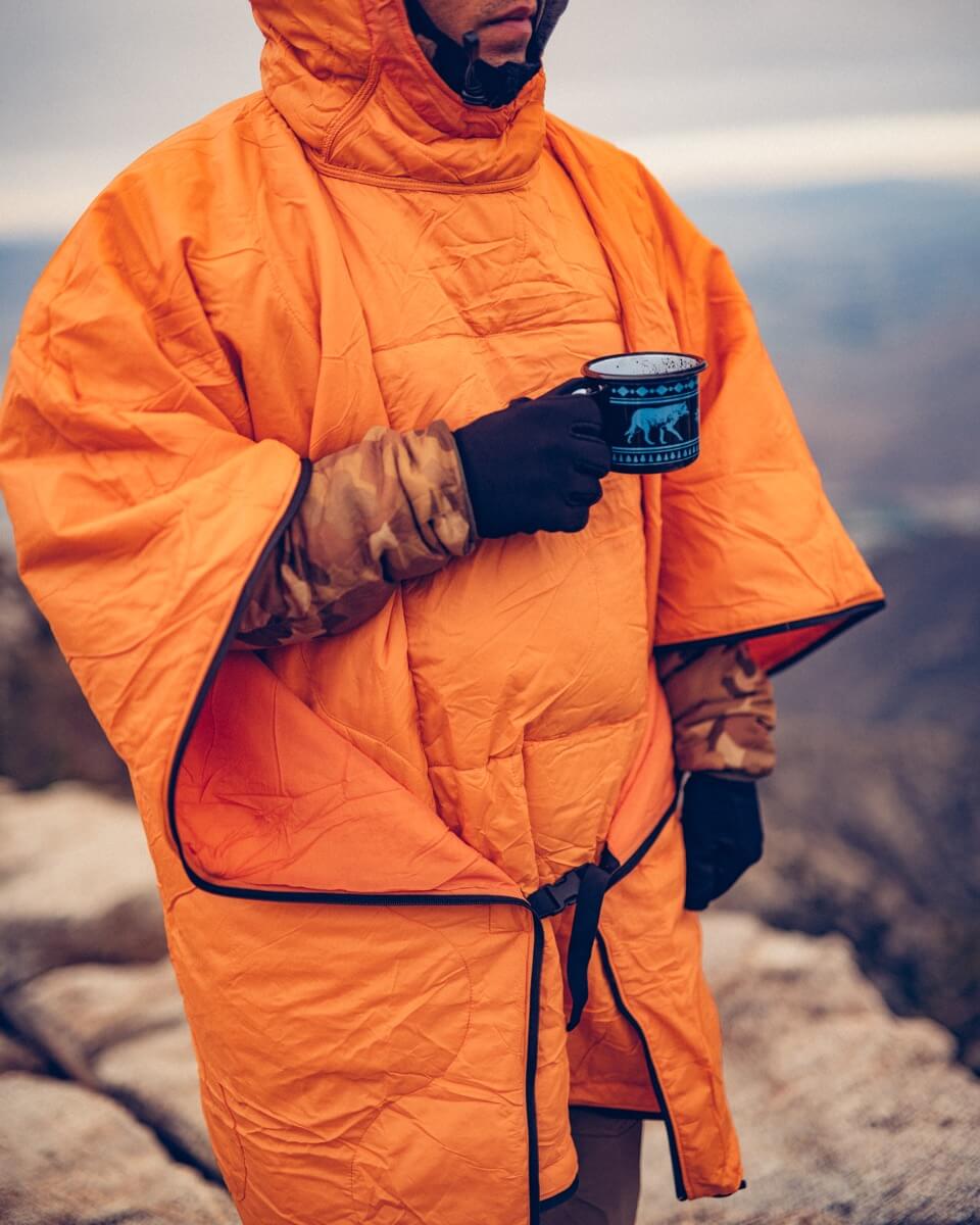 Swagman Roll to – w największym skrócie – ciepło, które możesz wykorzystać tak, jak tego potrzebujesz. To wielofunkcyjne narzędzie, którego można używać jako ciepłego poncho, lekkiego, samodzielnego śpiwora albo dodatkowego śpiwora-wkładki, jako podpinki ocieplającej pod hamak (tak zwany underquilt), lub po prostu jako koca. W każdej z tych ról Swagman Roll sprawdza się doskonale dzięki starannie przemyślanej koncepcji i świetnemu wykonaniu. Zamek błyskawiczny pozwala spiąć go w wygodny śpiwór, elastyczne taśmy z klamrami sprawiają, że noszony jako poncho dobrze trzyma się ciała, dając zarazem swobodę ruchów. Z kolei kiedy ma być użyty jako koc, kaptur poncha znika, jak za sprawą magii, dzięki dyskretnej kieszonce.