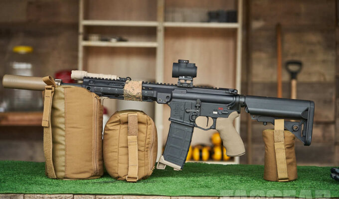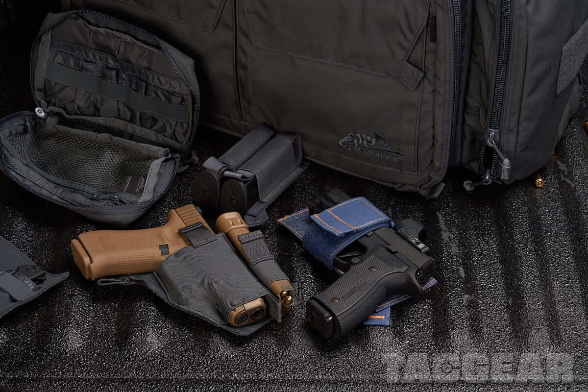 Torba Range Bag od Helikon-Tex wydała się dobrym wyborem na początek. Dość pojemna, z fajnym systemem modyfikacji wnętrza i przydatnymi wkładkami na magazynki. Wykończenie w środku umożliwia zmianę położenia wkładek w wygodny dla nas sposób. Dodatkowo można dokupić dodatkowe moduły, na przykład bardzo uniwersalny insert na pistolet INVERTED PISTOL HOLDER INSERT, lub PISTOL HOLDER INSERT w którym mieści się Glock, ale niestety SIG P320 już słabo. Torba mieści naprawdę dużo gratów, a dzięki wielu bocznym kieszeniom pozwala dobrze zorganizować poszczególne przedmioty – osobna kieszeń na rękawiczki, osobna na baterie itp.